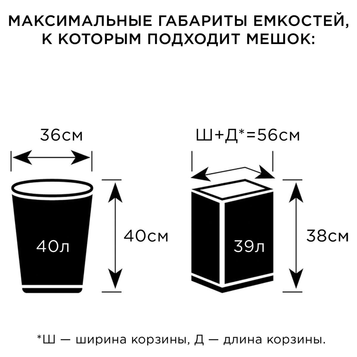Изготовлены из высококачественного полиэтилена низкого давления (ПНД) с плотностью 10 микрон. Вместительность 60 литров, размер 58х68 см (±5%). Поставляются в удобном рулоне по 20 штук. Грузоподъемность - на высоте.